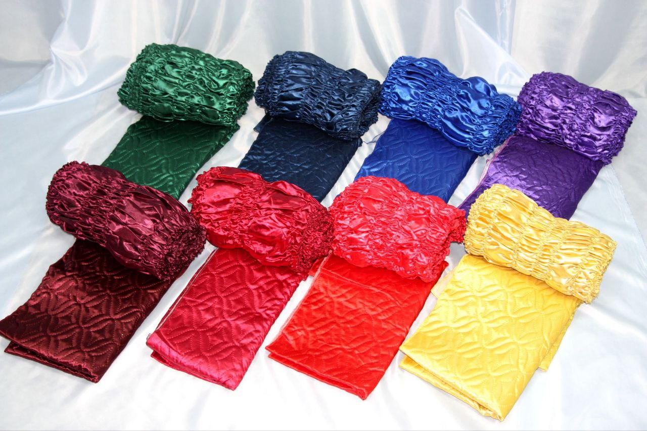 Четырехгранный. Длина - 170-200 см. Обивка - атлас. Цвет - золото.